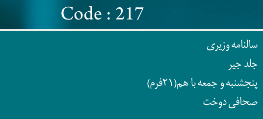 دستهبندی: سالنامه و سر رسیدابعاد: 24/5*17/5ویژگیها: جلد جیرویژگیهای خاص: پنجشنبه و جمعه در یک صفحه