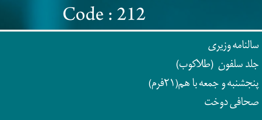 دستهبندی: سالنامه و سر رسیدابعاد: 24.5*17.5ویژگیها: جلد سلفونموارد استفاده: پنجشنبه و جمعه در یک صفحه