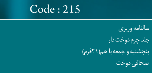 دستهبندی: سالنامه و سر رسیدابعاد: 24.5*17.5ویژگیها: جلد چرمموارد استفاده: پنجشنبه و جمعه در یک صفحه